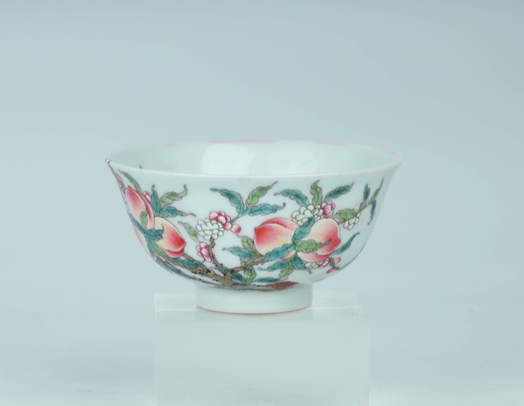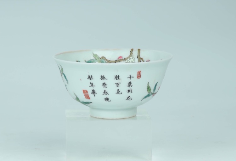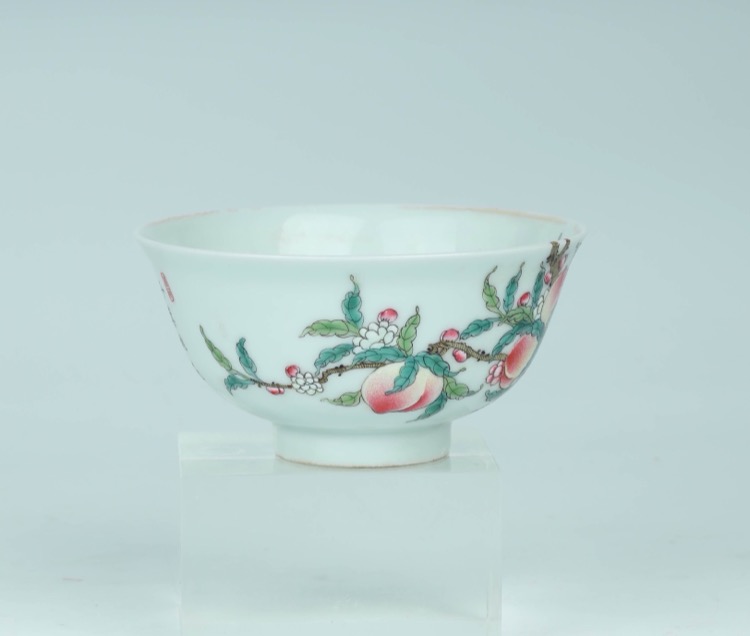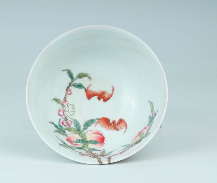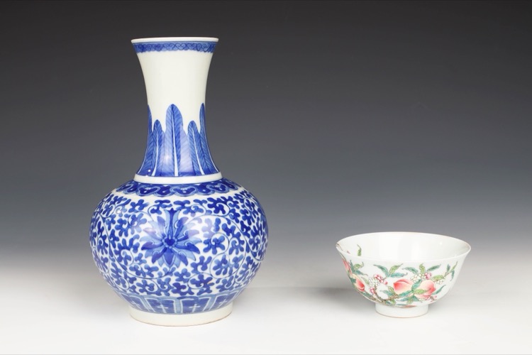 Comprising a blue and white bottle vase decorated with floral patterns and scrolling foliage, and a famille rose bowl decorated with peaches and bats, four-character Jingweitang mark. (2pcs)