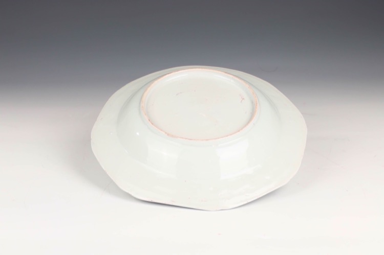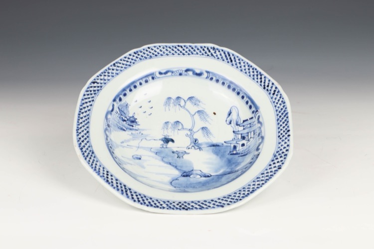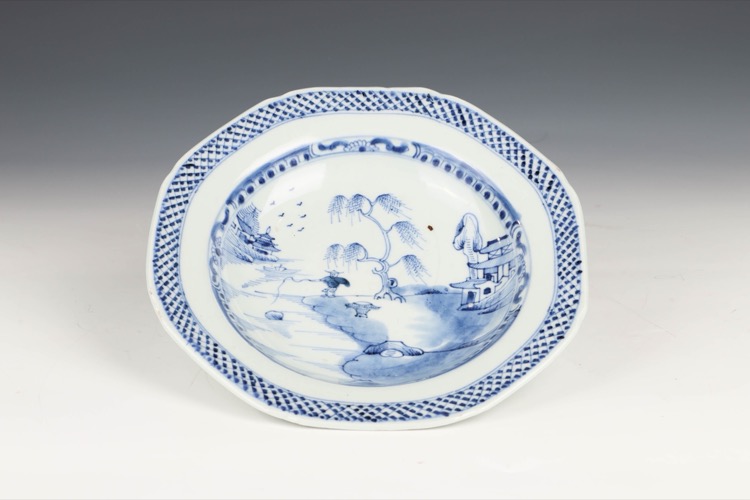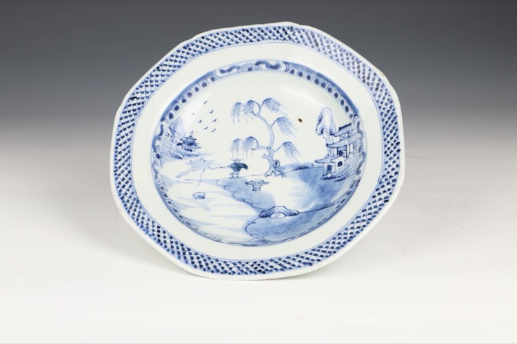 Blue-and-white plate decorated with a man fishing besides a river with willow tree and temples in the background.