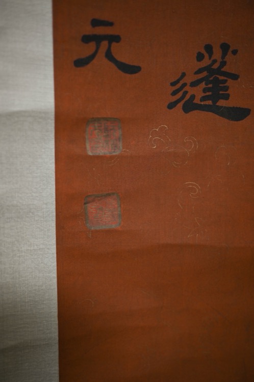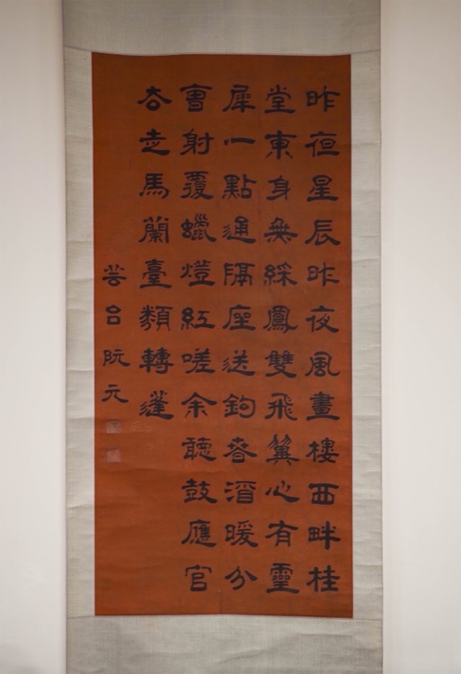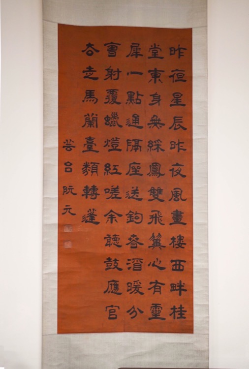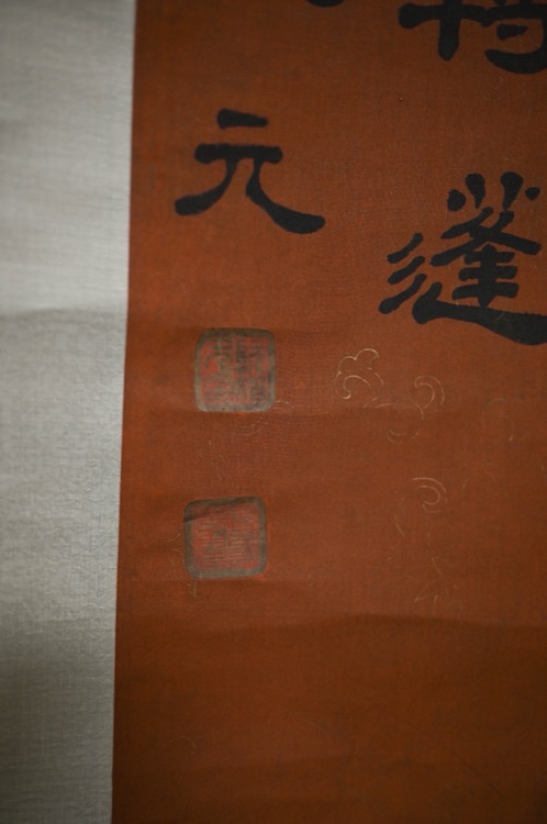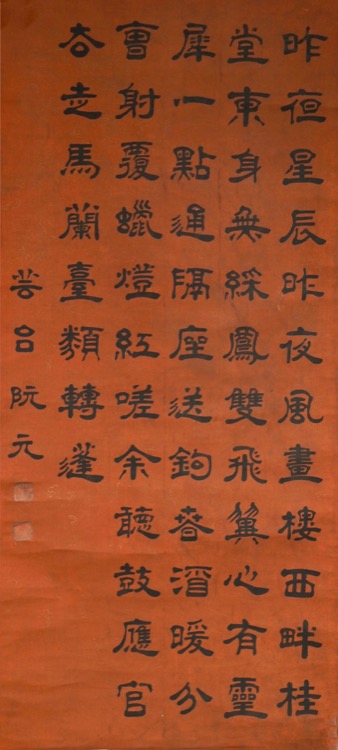 Hanging scroll of li-script calligraphy. 2 artists’ seals to the left.