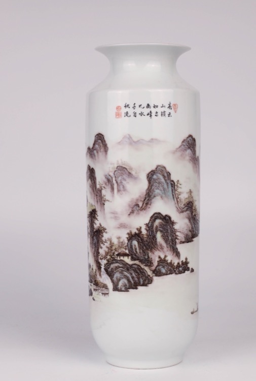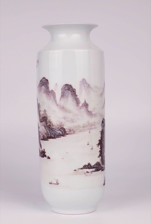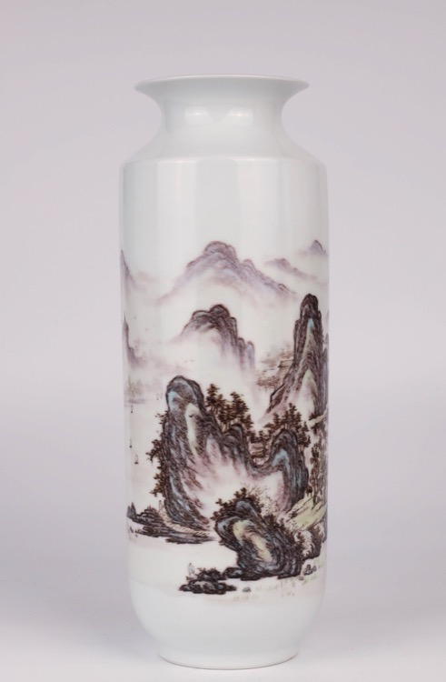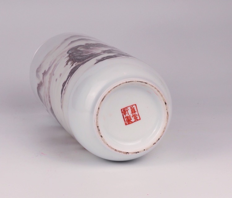 A famille-rose sleeve vase, the cylindrical body rising to curved shoulders surmounted by a waisted neck, painted to the exterior with a landscape scene of mountains and pavilions, with four-character “zhen shuang xuan zhi” mark in undergalze red.