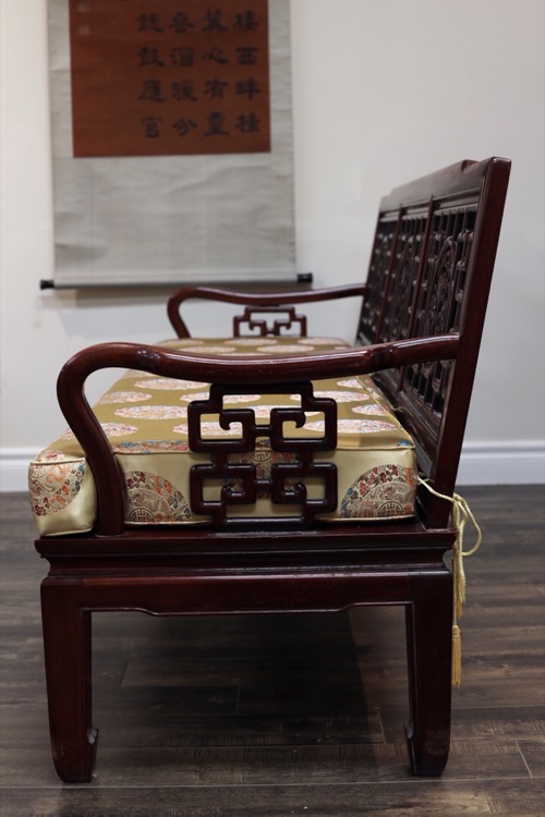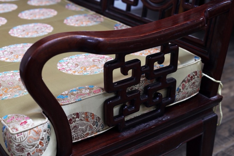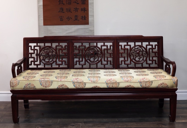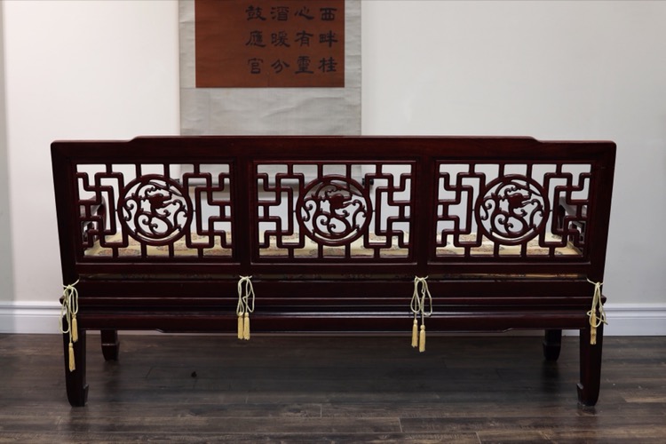 Huanghuali carved three-seater sofa decorated with openwork chilong carving.