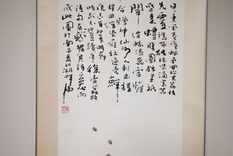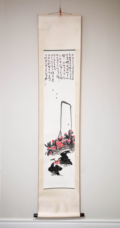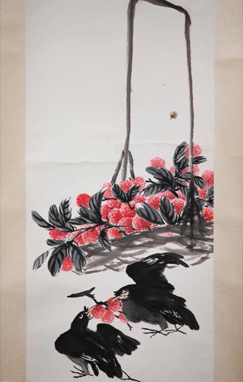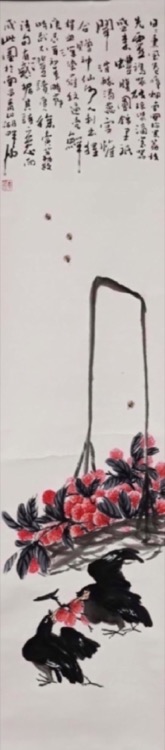 Hanging scroll depicting two magpies eating lychees and a basket filled with lychees surrounded by several bees. Lengthy calligraphic scripts and the artist’s seal to the top.