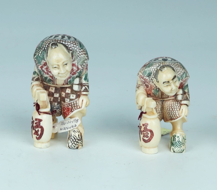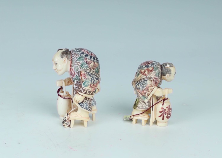 Pair of Carved Ivory Polychrome Okimono of A Man Holding a Lamp, 20th Century