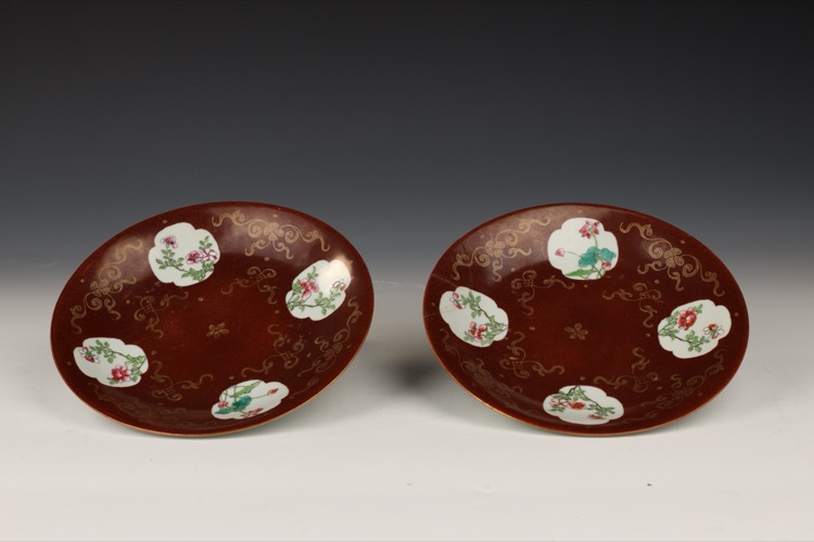Pair of Persimmon-Glazed Famille Rose Floral Dishes, Qing Dynasty
