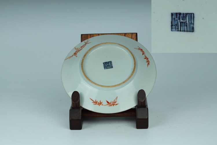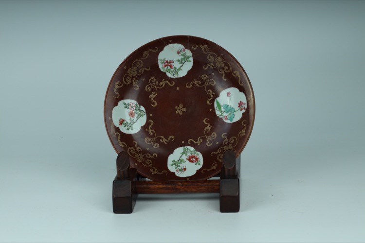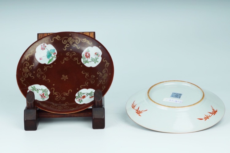 清嘉慶 紫金釉粉彩開光描金盤一對
