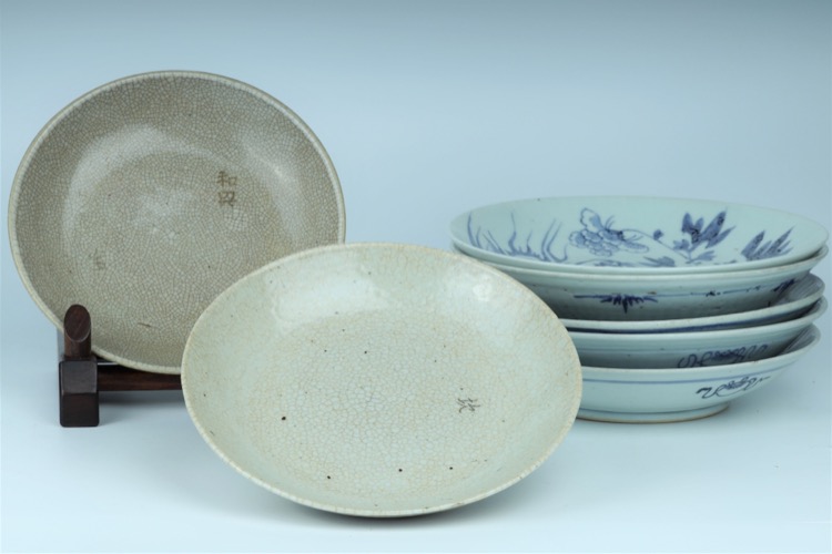 Comprising a pair of Qing dynasty blue-and-white flower and phoenix plates, a pair of blue-and-white shou-character plates, a pair of Ge-type crackle glaze plates, and a blue-and-white shou-character plate. (7pcs)