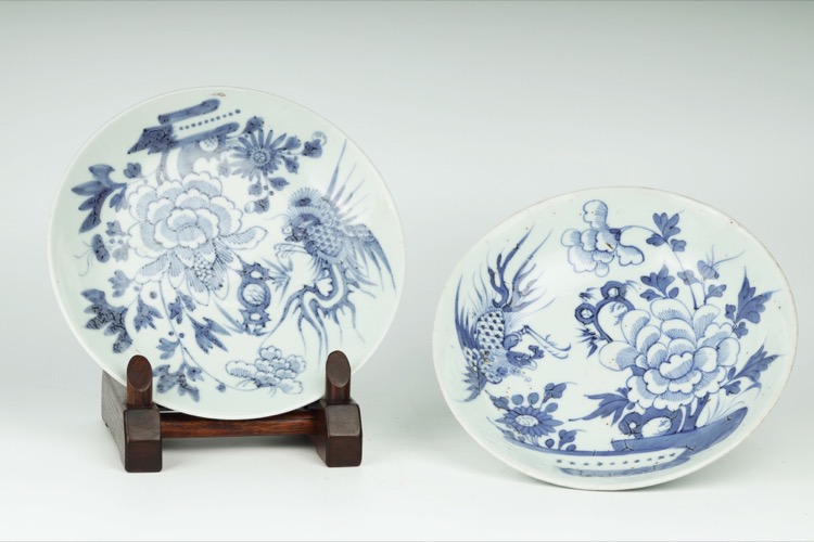 清 青花牡丹鳳凰紋盤一對