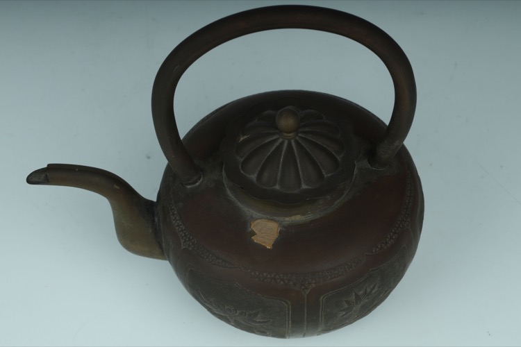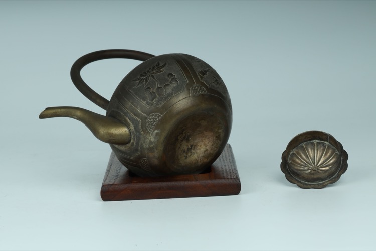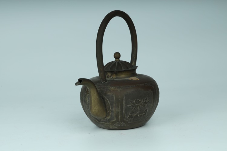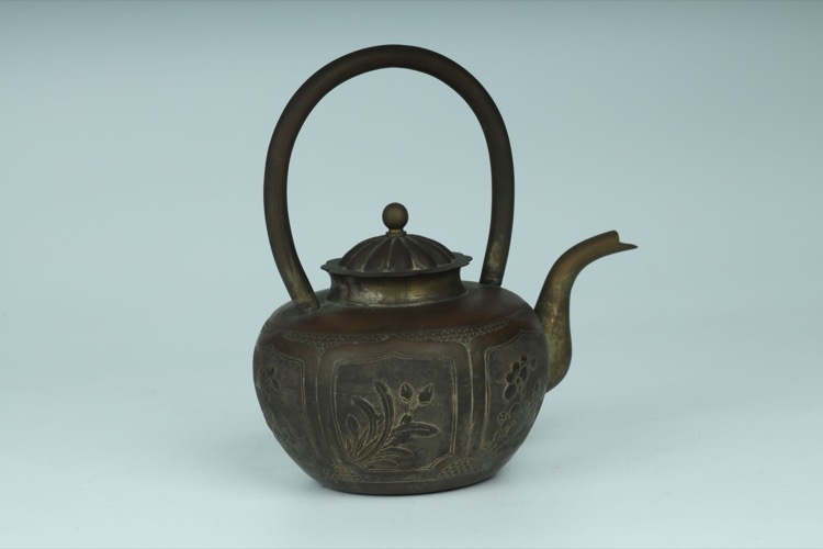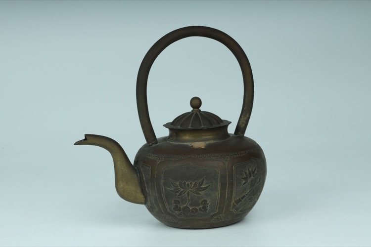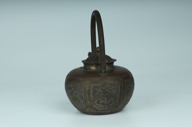 Silver handled teapot decorated with panels with plum, orchid, bamboo and chrysanthemum.