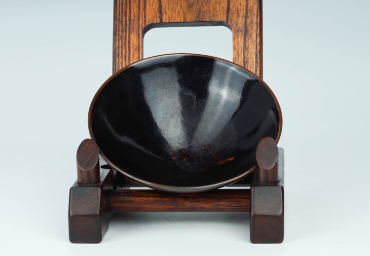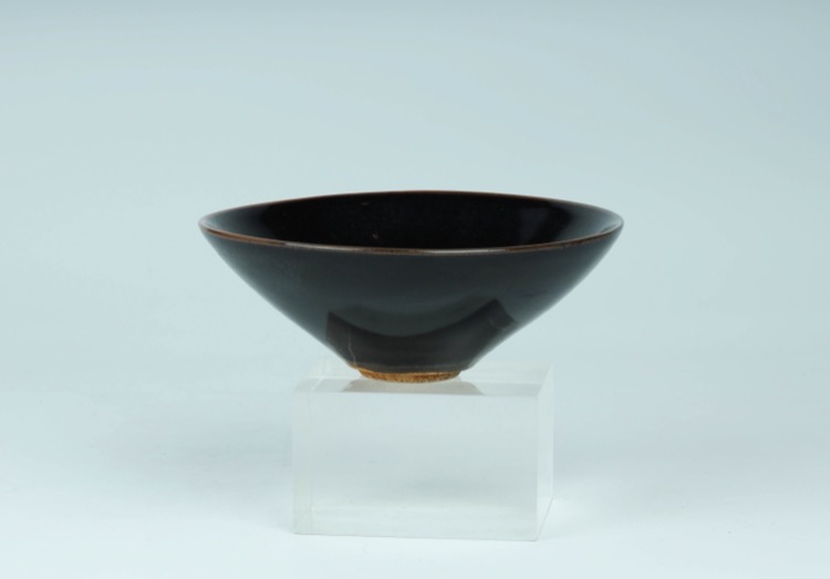 Of conical shape, covered with a brownish-black glaze thinning at the rim, decorated on the interior with a worm-eaten leaf.