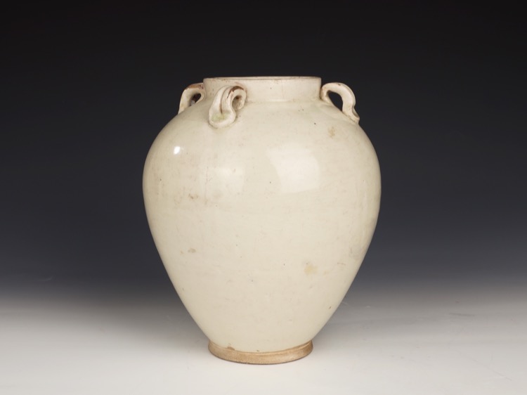 Of elongated ovoid form with a low cylindrical neck and rim, the shoulders with 4 heavily formed double lug handles luted to the body, narrow splayed unglazed foot, the glaze of cream white and finely crackled.