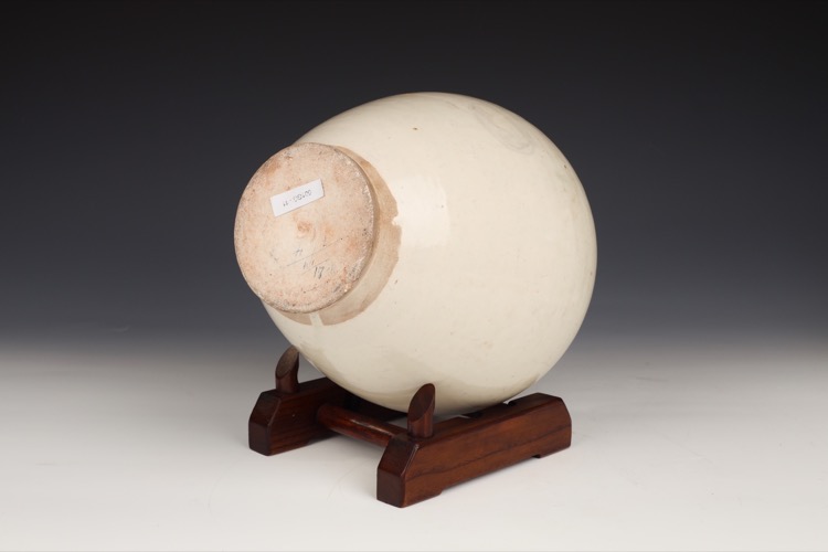 Compare with a similar white stoneware jar in the collection of the British Museum, dated Sui (581-618), Hebei province, ref. 1968,0422.23 Sedgwick Bequest. Compare also with a very similar jar from the Collection of Sakamoto Goro in Sotheby’s New York, sale 13SEP16 Lot 7, 30.9 cm H.
