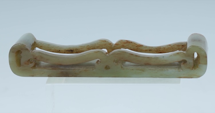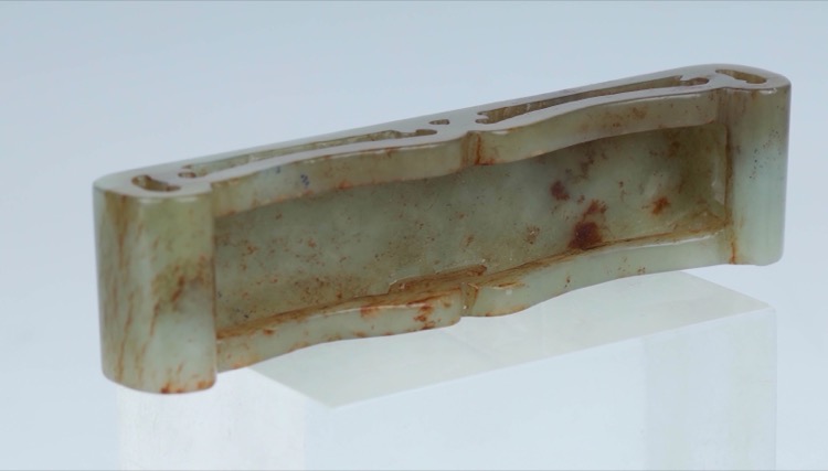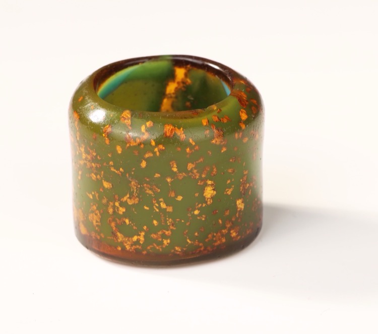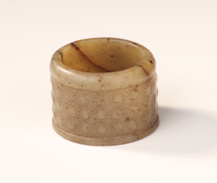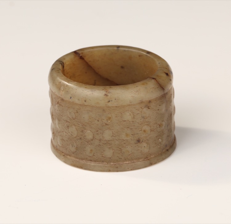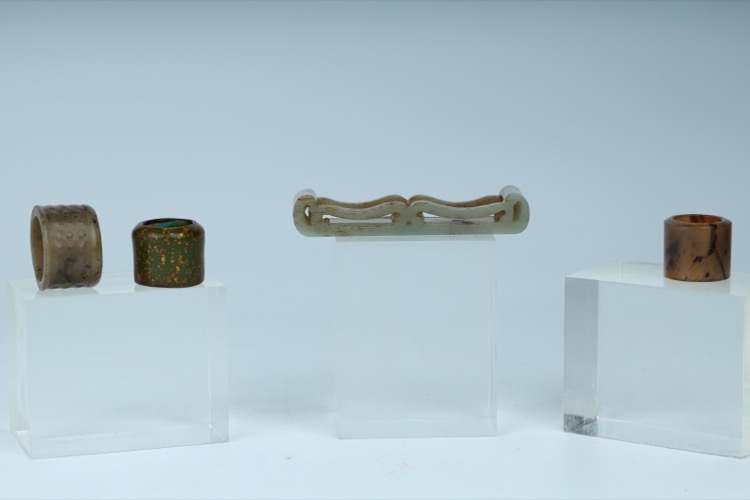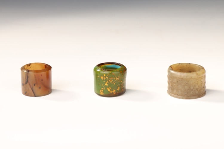 Comprising three thumb rings in nephrite jade, agate and Peking glass and a stand. (4pcs)