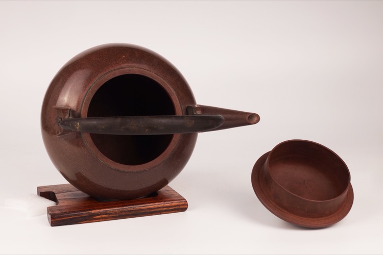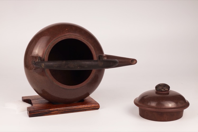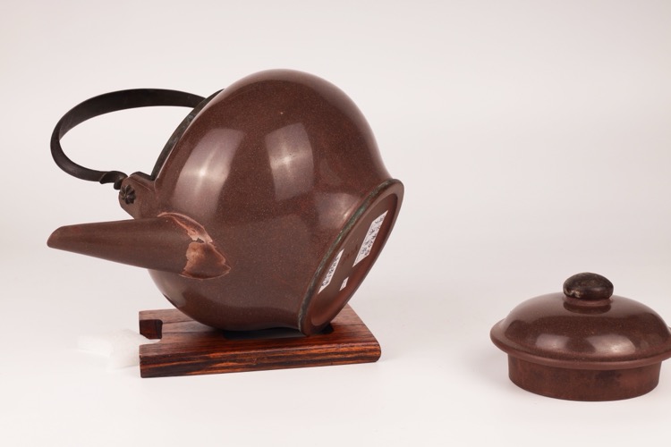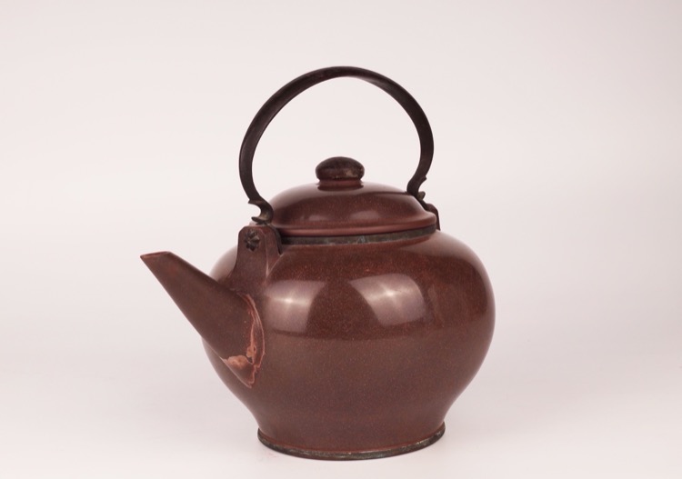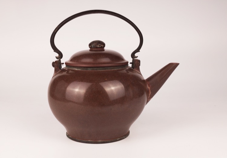 Tributary Yixing zisha teapot and lid with brown speckled glaze and metal handle.