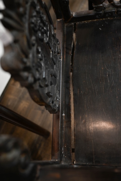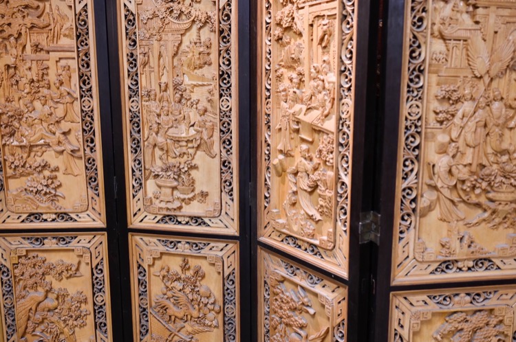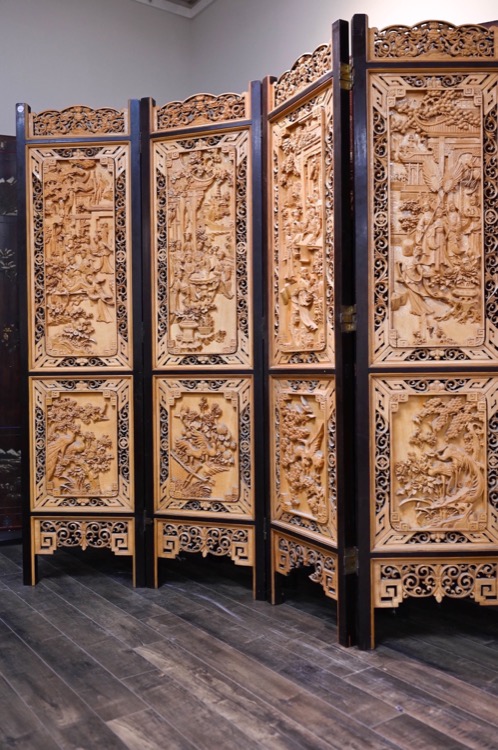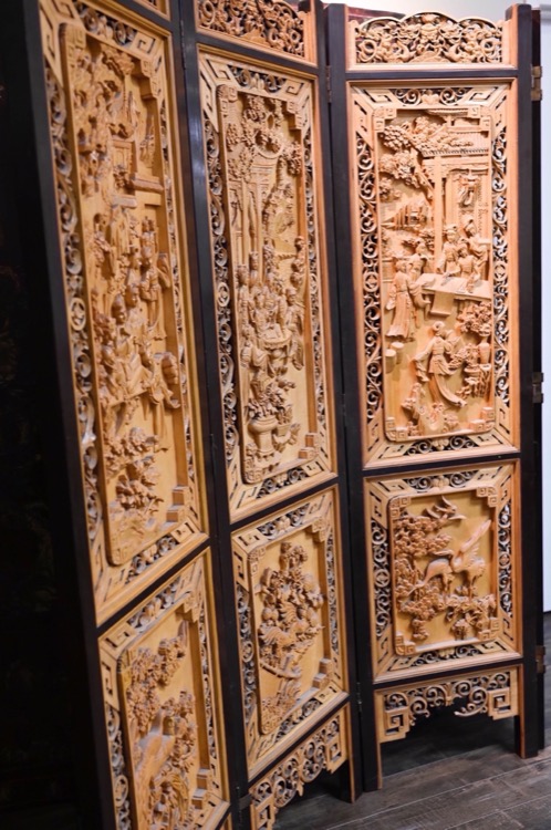 20世紀 黃楊木鏤雕庭院仕女圖四葉屏風