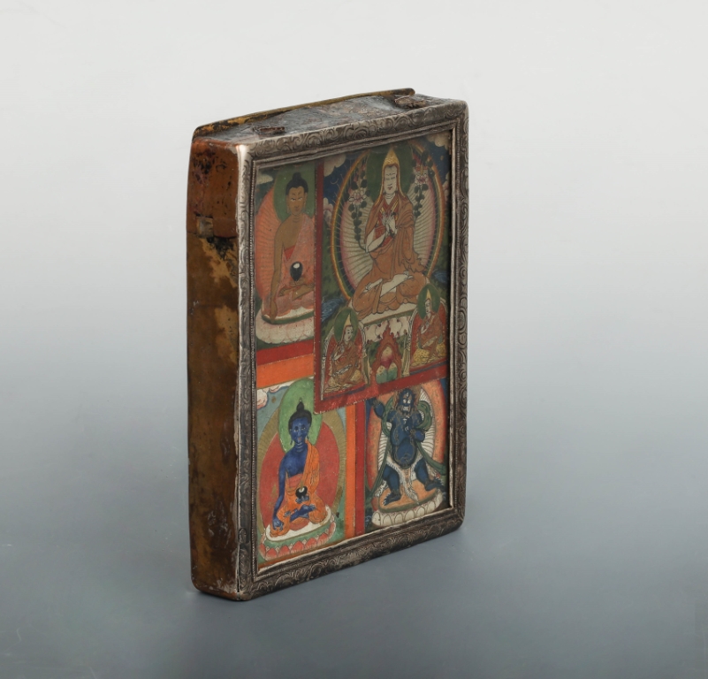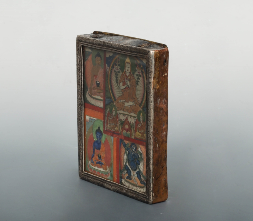 Ga’u Silvered Copper Frame of 4 Tsakali Cards – Tsonkhapa, Mahakala, Amitabha, Bhaisyajaguru, Tibet