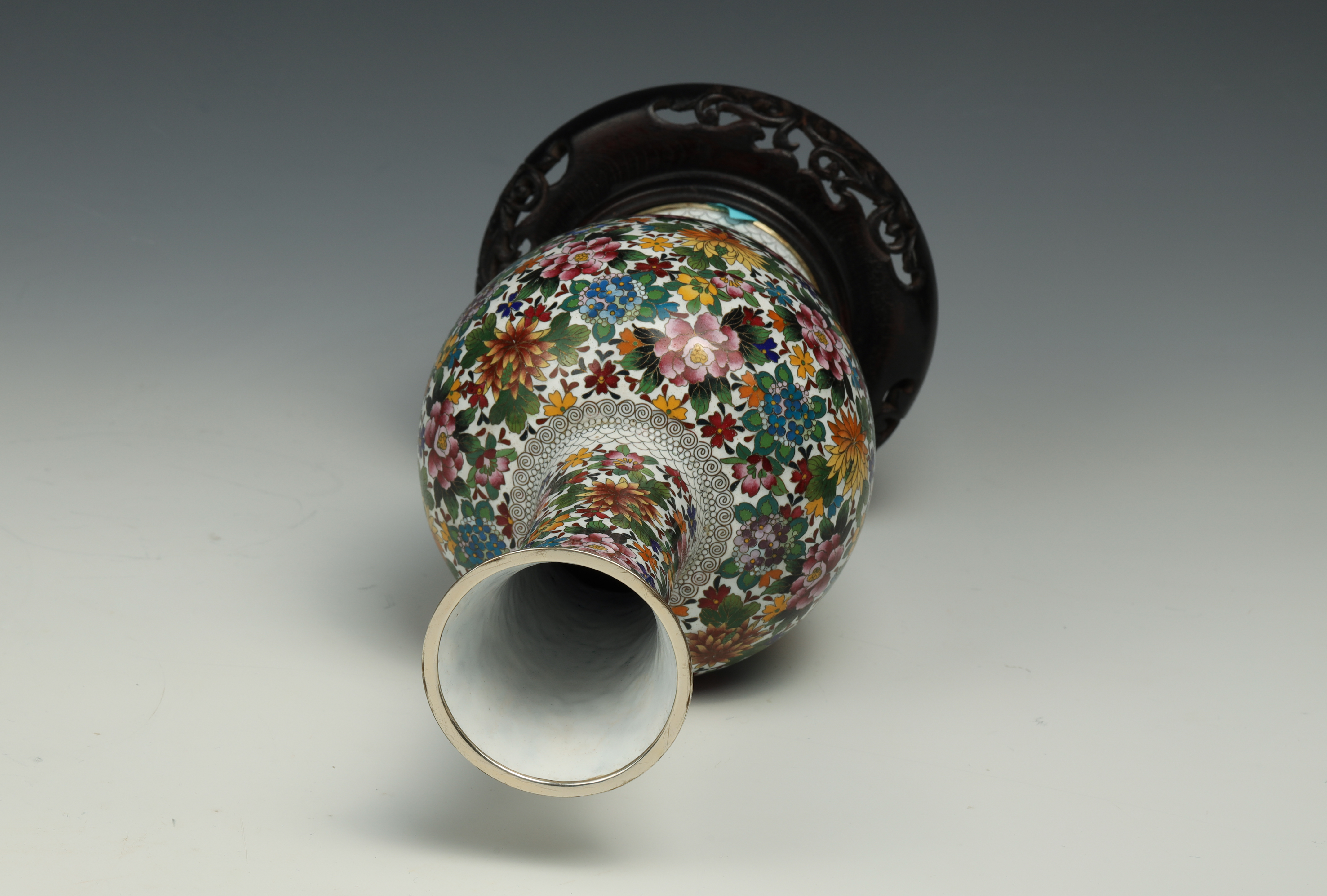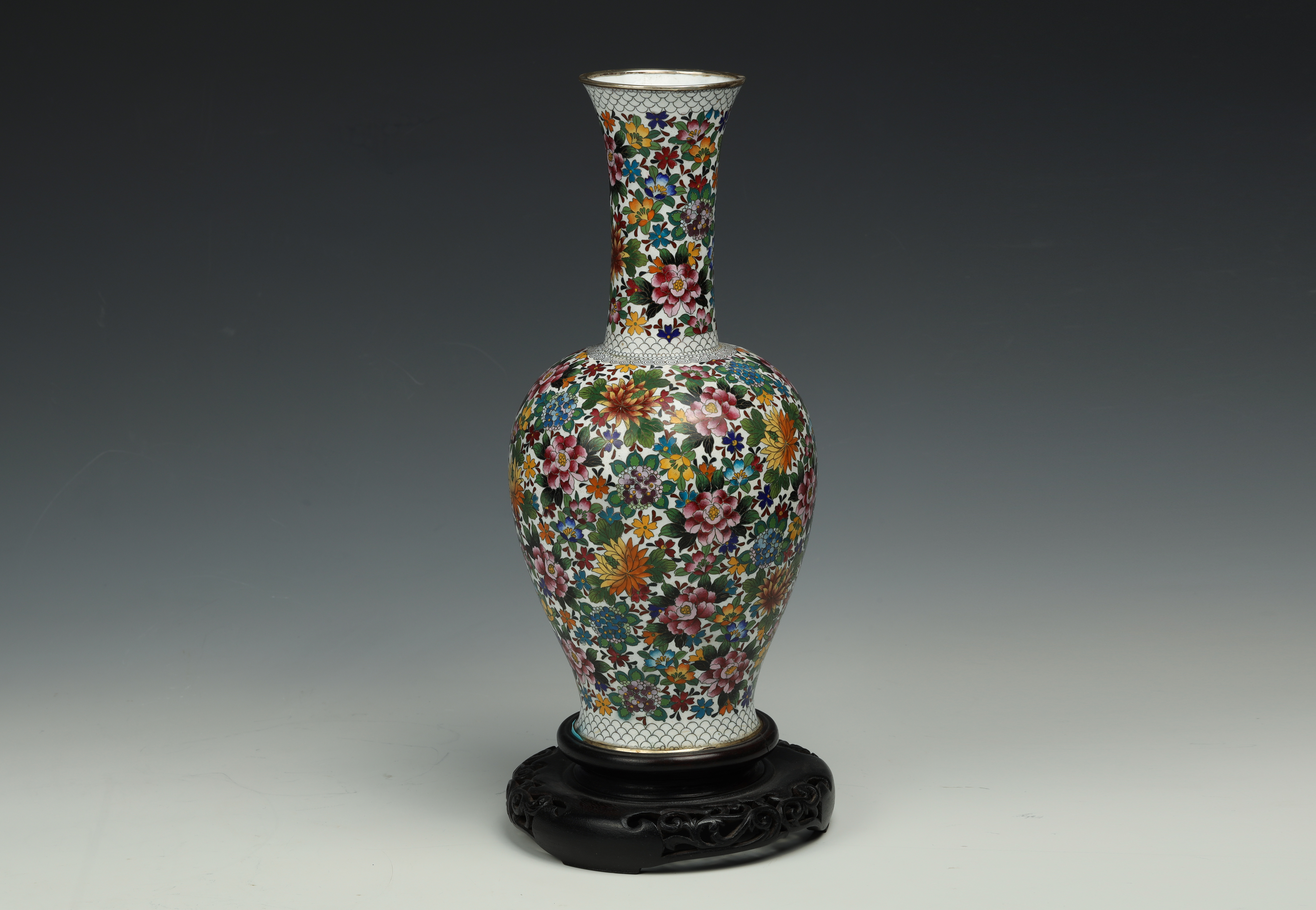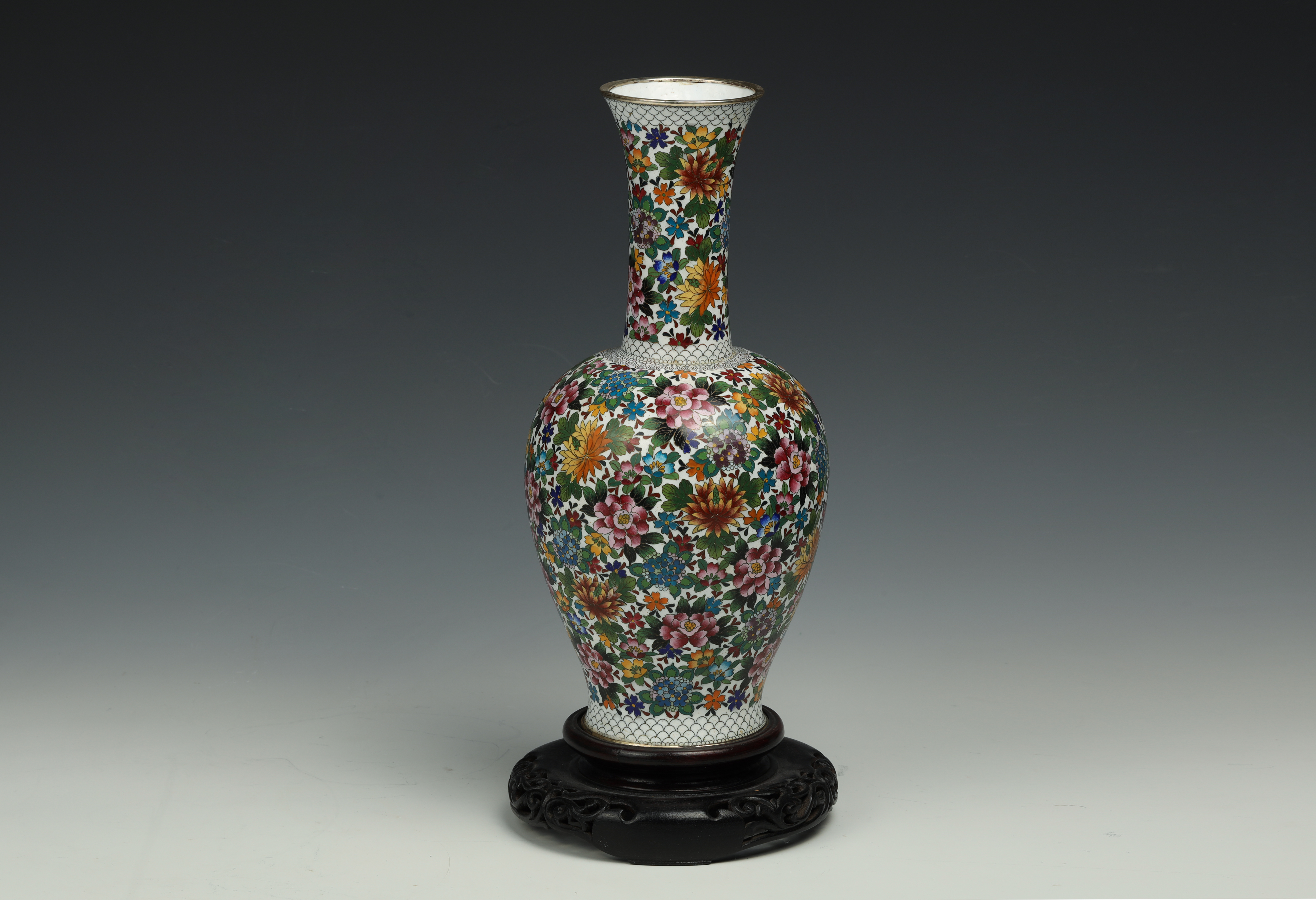 20th Century Bronze Body Painted Enamel Hundred Flowers Garden Vase with Stand (Punched)