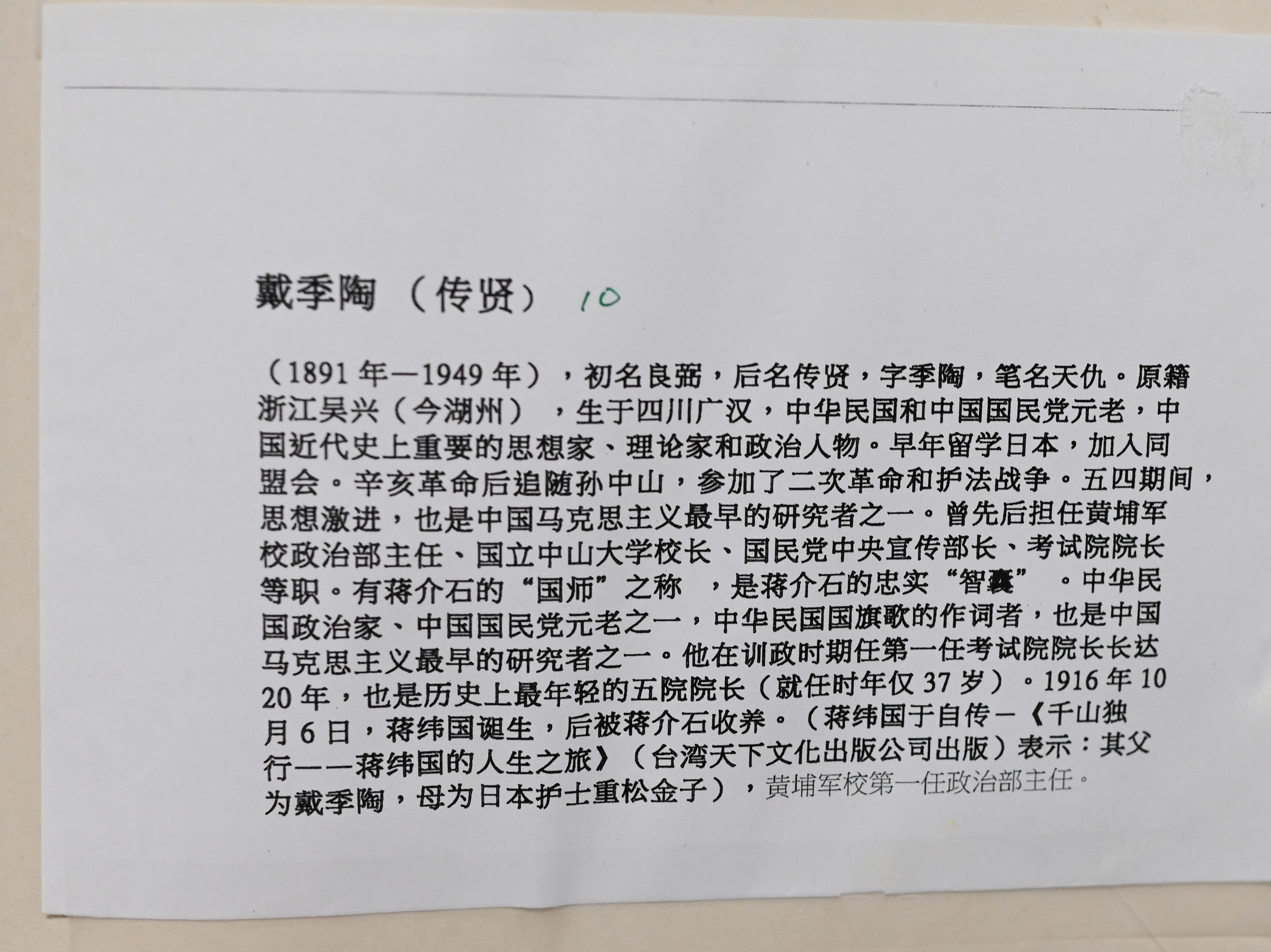 (1891年-1949年),初名良弼,后名传贤,字季陶,笔名天仇。原籍浙江吴兴(今湖州) ,生于四川广汉,中华民国和中国国民党元老,中国近代史上重要的思想家、理论家和政治人物。早年留学日本,加入同盟会。辛亥革命后追随孙中山,参加了二次革命和护法战争。五四期间,思想激进,也是中国马克思主义最早的研究者之一。曾先后担任黄埔军校政治部主任、国立中山大学校长、国民党中央宣传部长、考试院院长等职。有蒋介石的“国师”之称 ,是蒋介石的忠实“智囊”。中华民国政治家、中国国民党元老之一,中华民国国旗歌的作词者,也是中国马克思主义最早的研究者之一。他在训政时期任第一任考试院院长长达20年,也是历史上最年轻的五院院长(就任时年仅37岁)·1916年10月6日,蒋纬国诞生,后被蒋介石收养。(蒋纬国于自传-《千山独行–蒋纬国的人生之旅》(台湾天下文化出版公司出版)表示:其父为戴季陶,母为日本护士重松金子),黄埔军校第一任政治部主任。