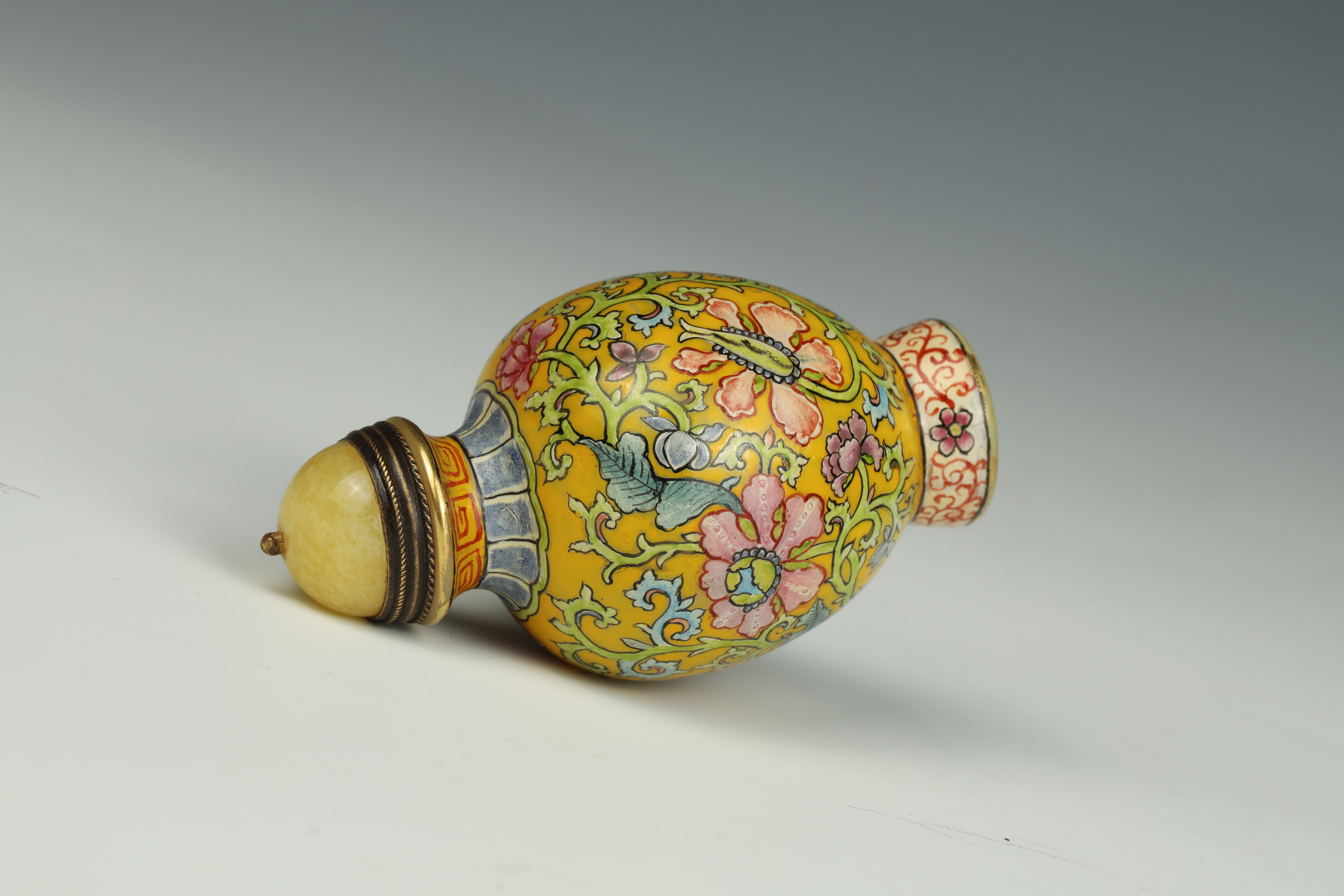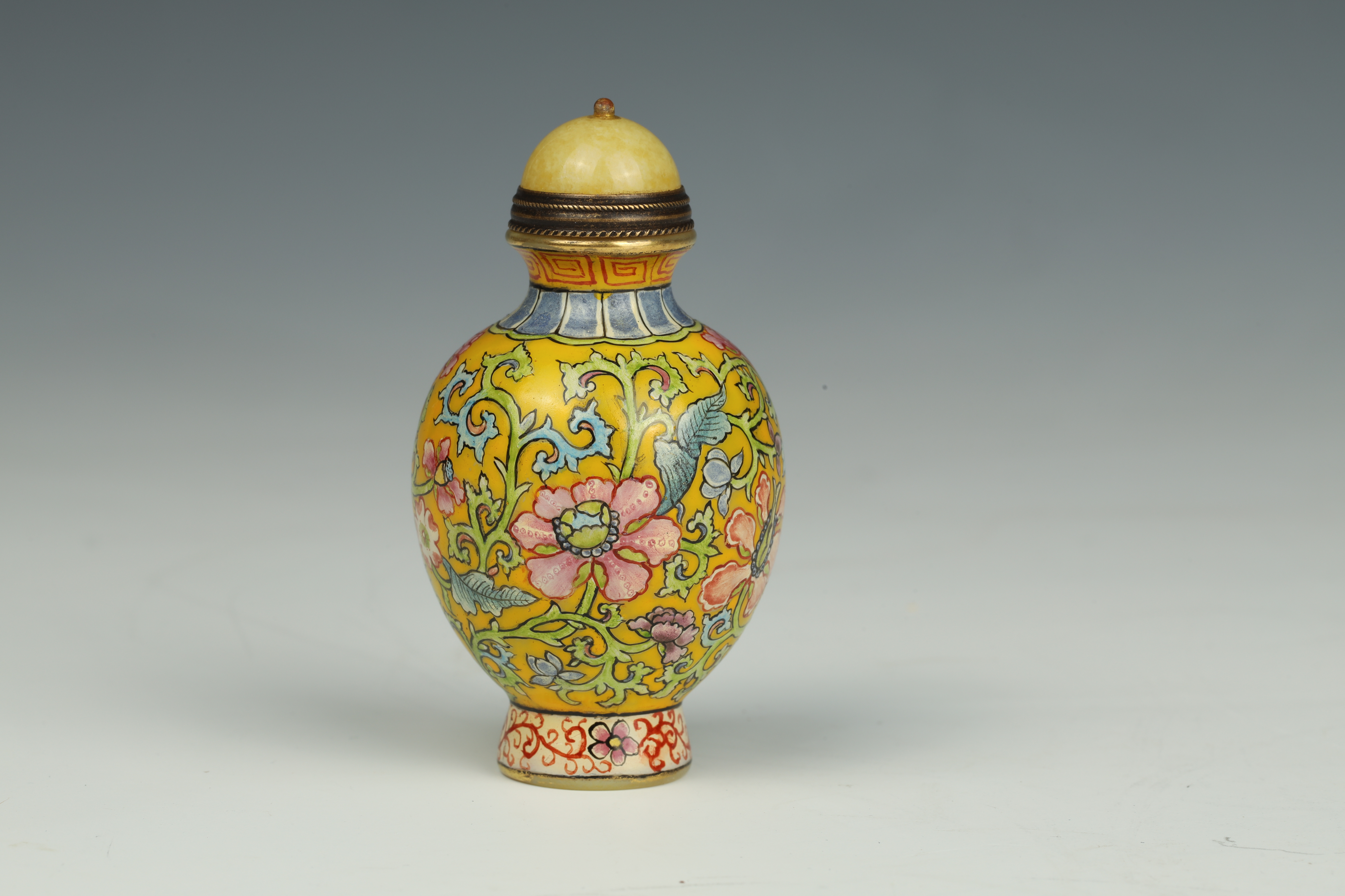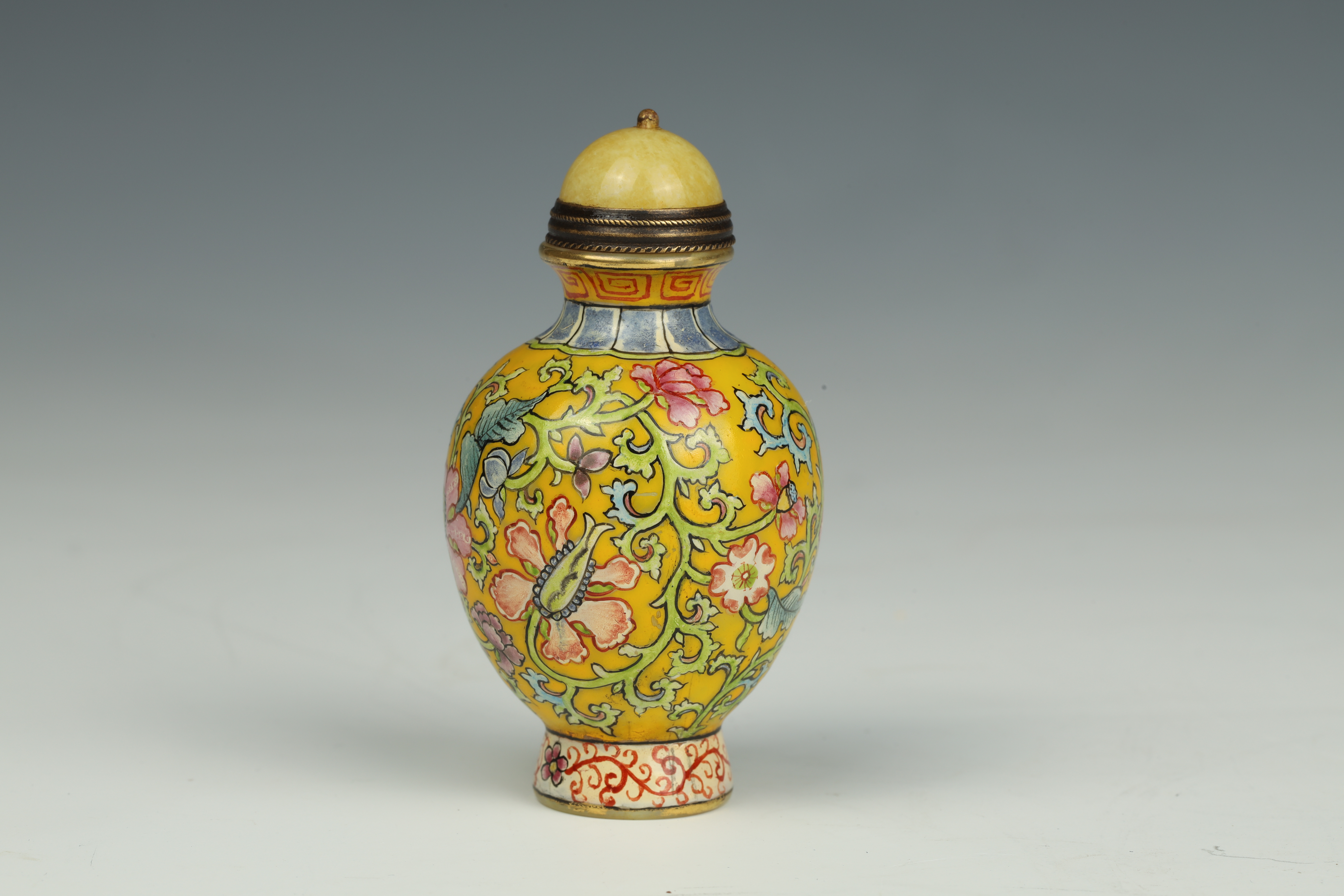 Dimensions: 2 3/4″ (7cm) H 料器或珐琅缠枝花卉鼻烟壶