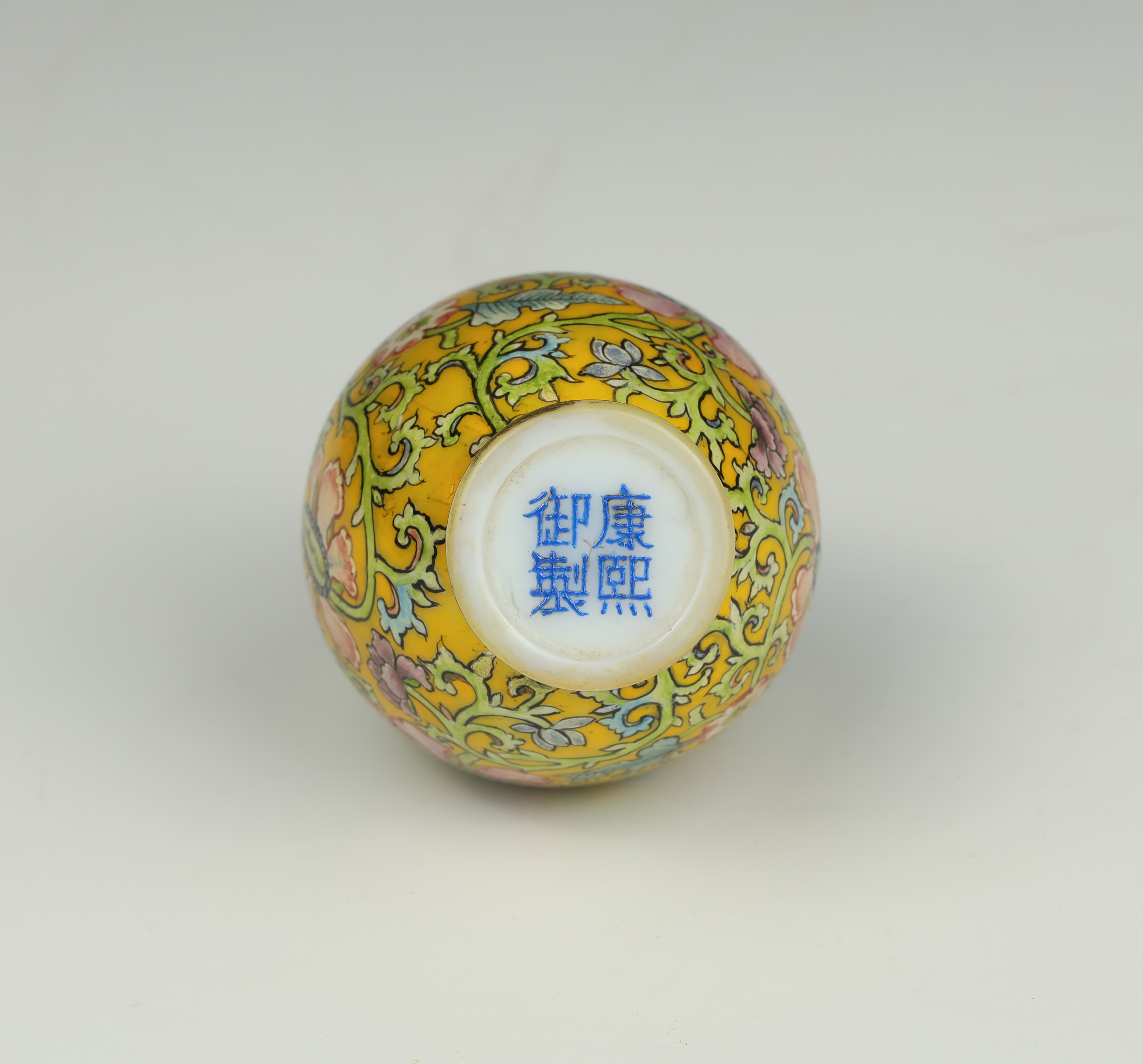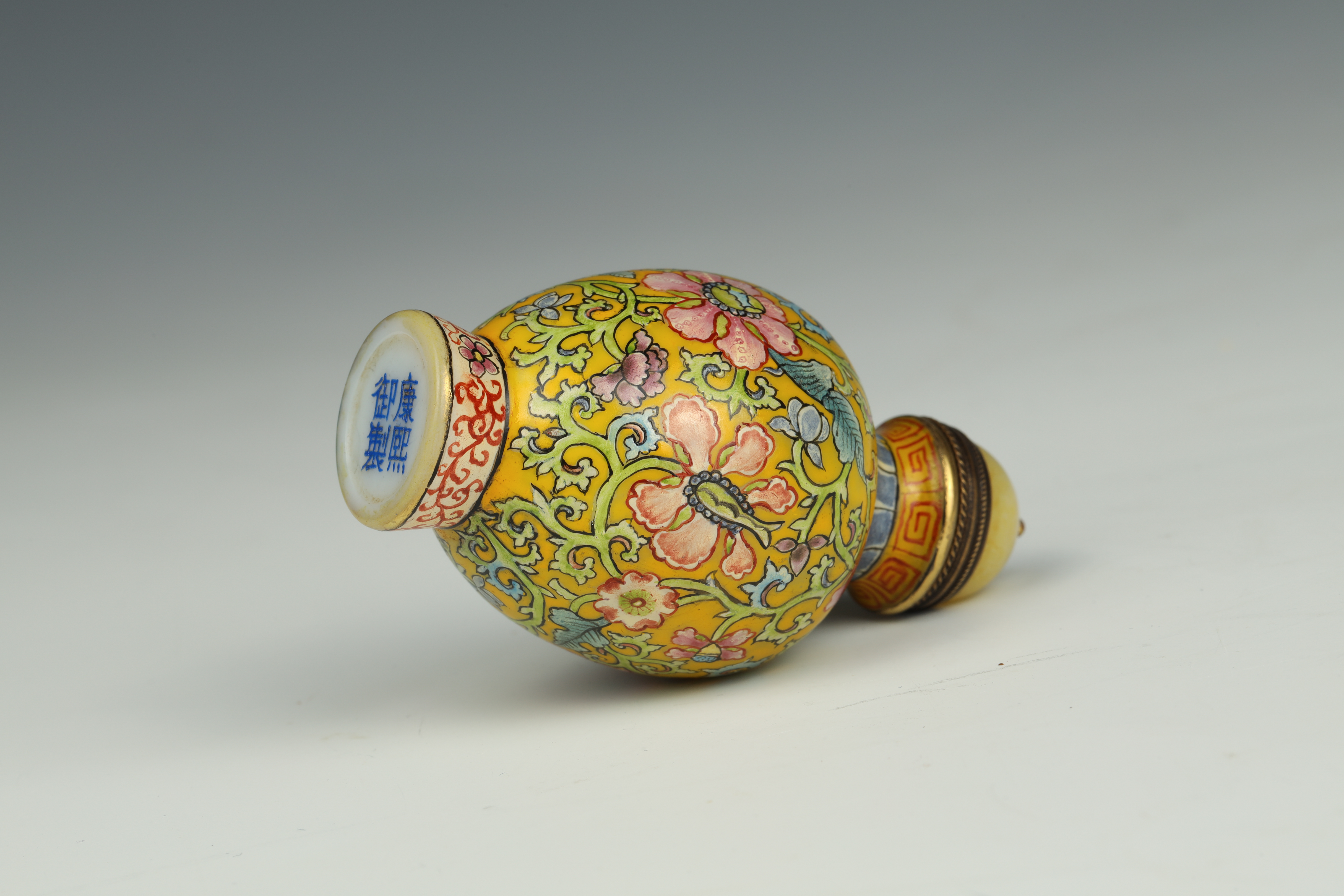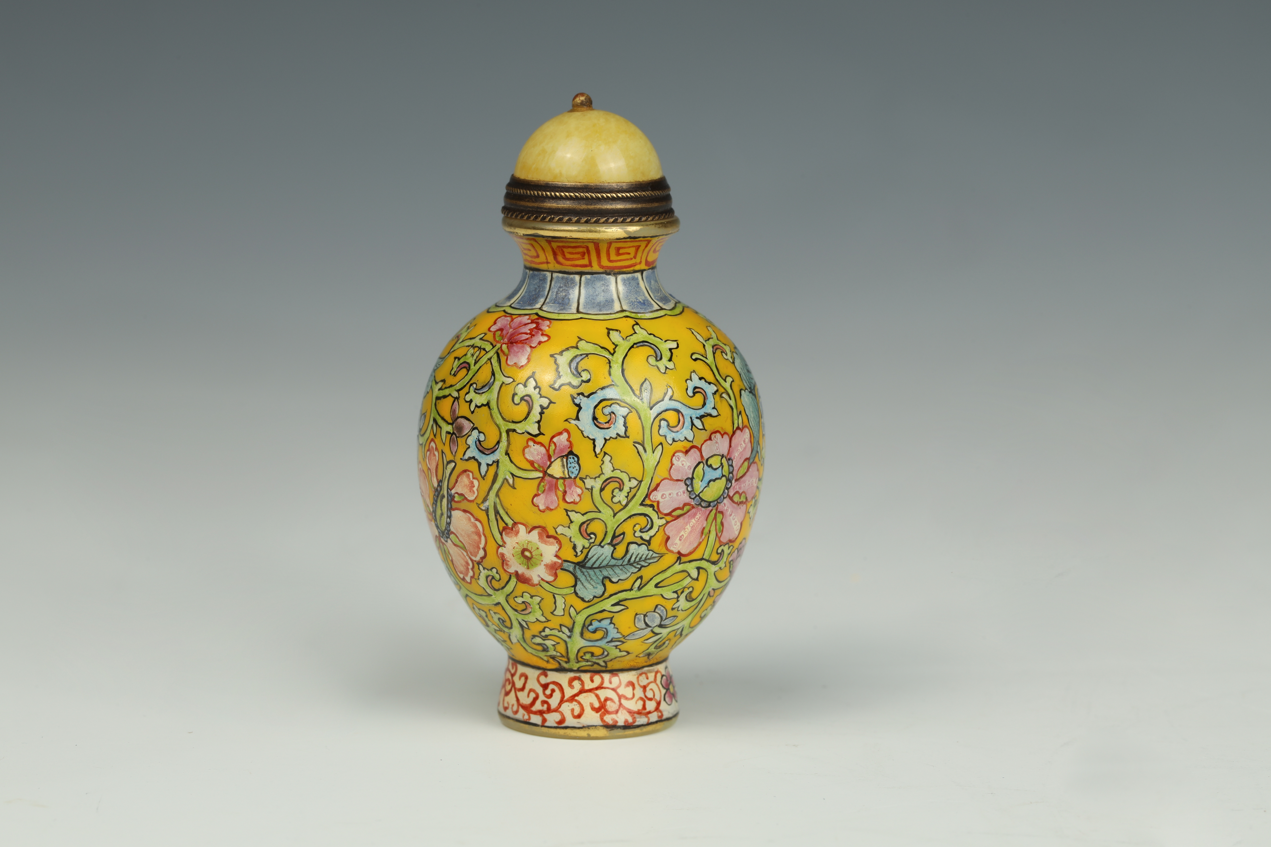 Dimensions: 2 3/4″ (7cm) H 料器或珐琅缠枝花卉鼻烟壶
