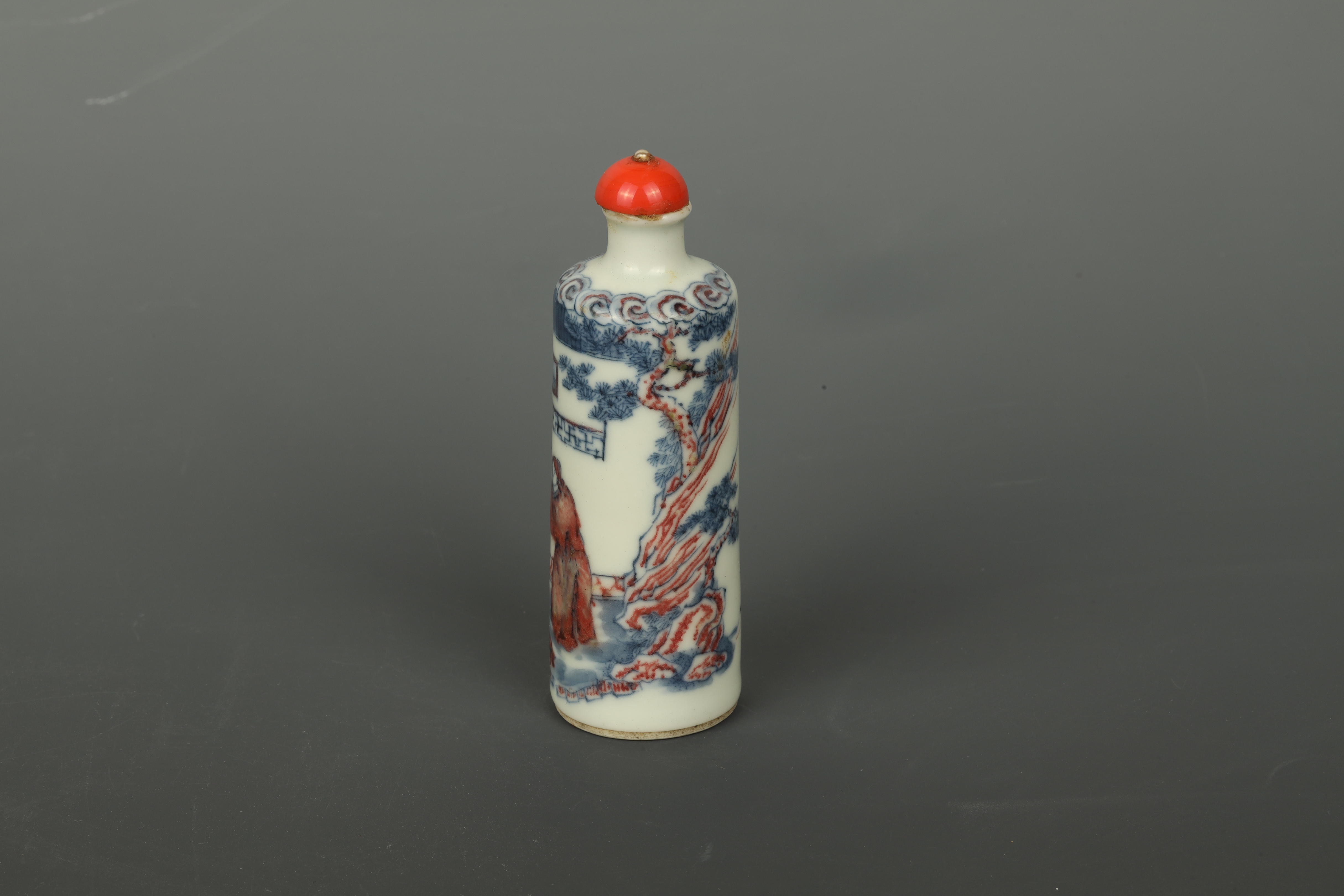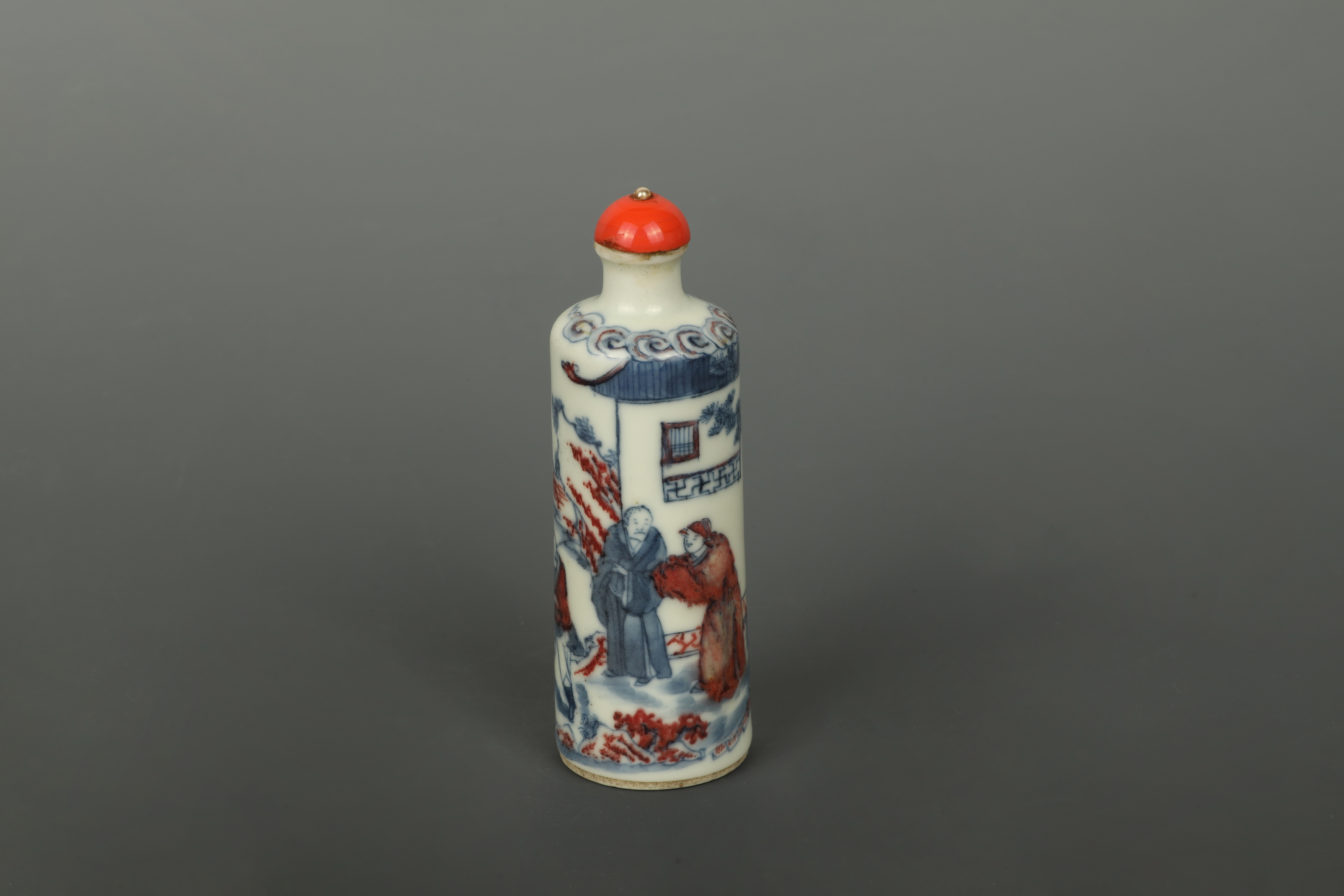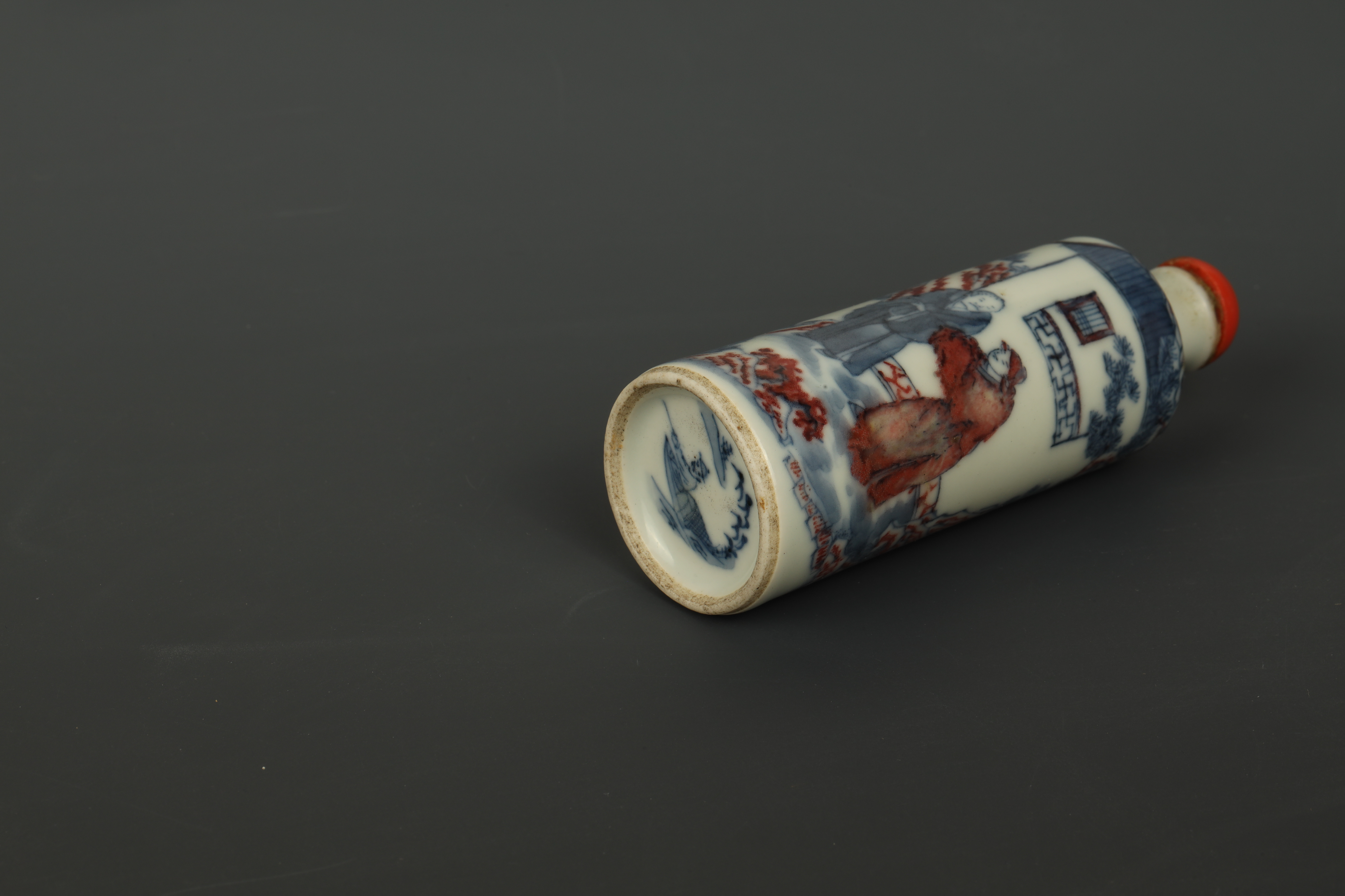 Qing Dynasty blue and white glaze red character story snuff bottle