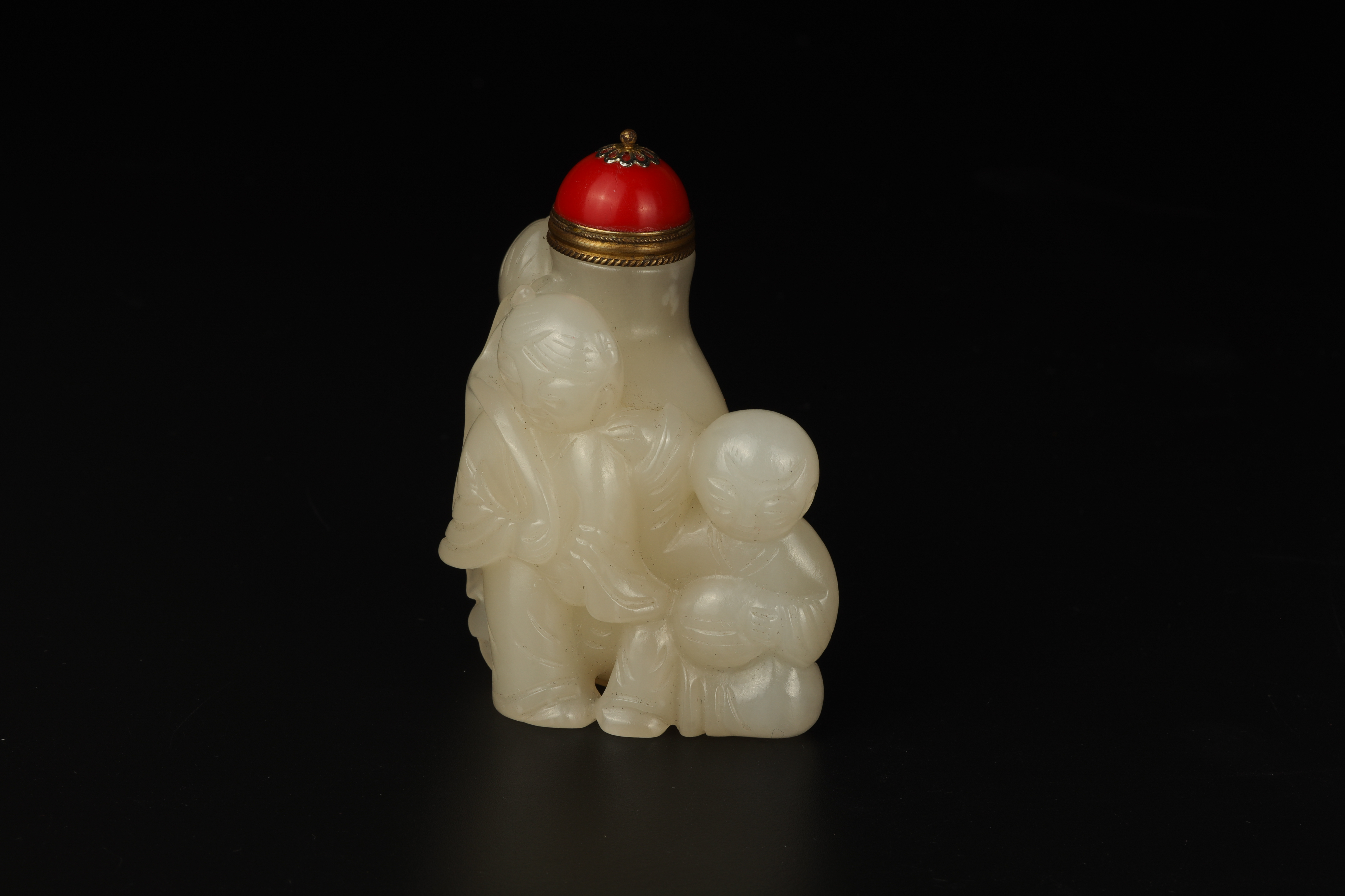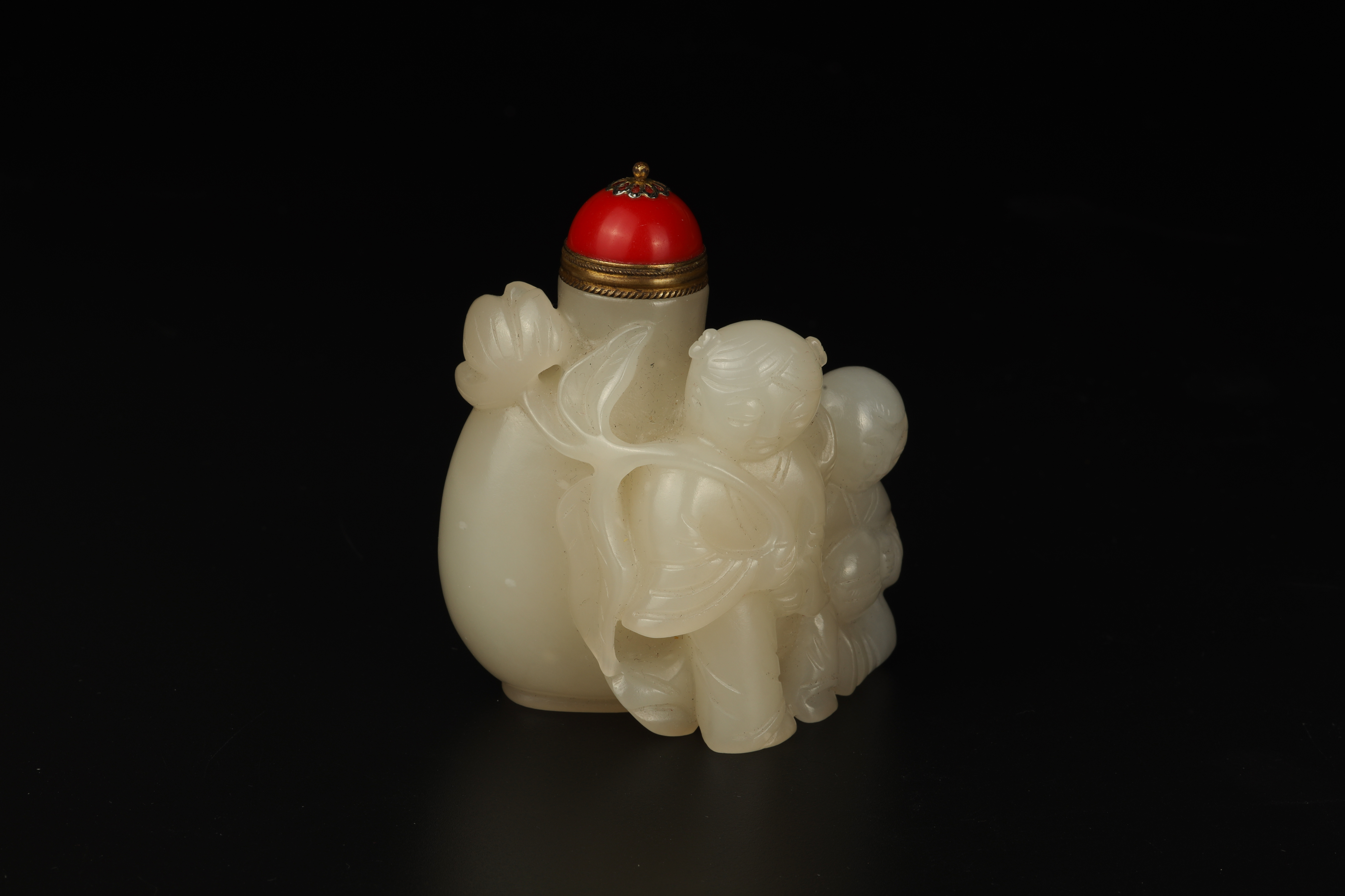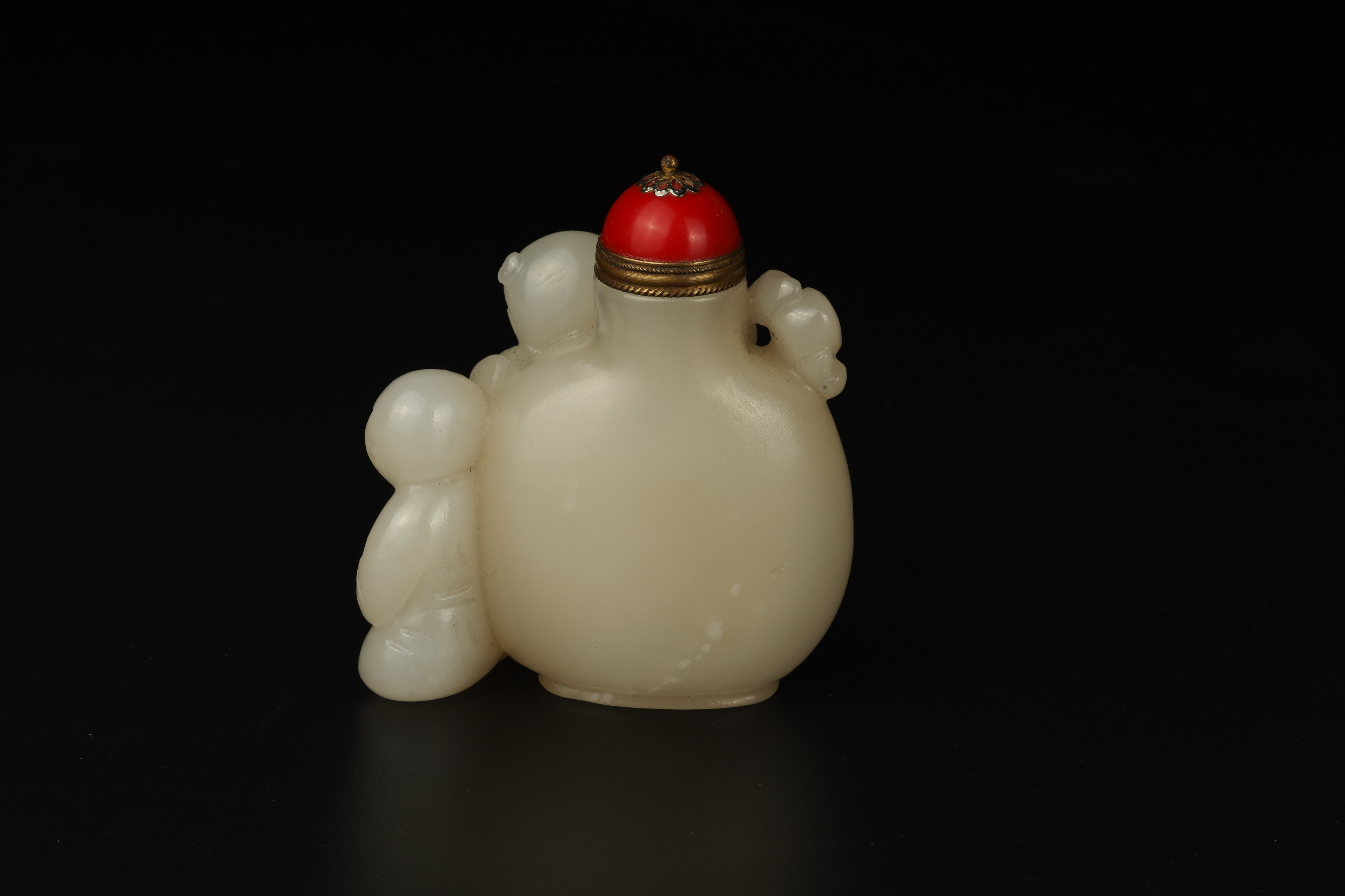Dimensions: 3″ (7.5cm) H 白玉雕双童子鼻烟壶